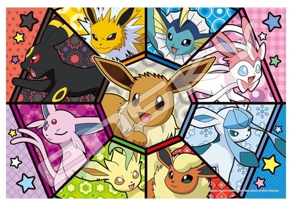 A 300-piece Art Crystal puzzle featuring Eeevee in various evolutionary forms in a Stain Glass Pattern. Art Crystal puzzle is a special transparent piece jigsaw puzzle that allows light to pass through. The completed puzzle is about 10.24" x 14.96".